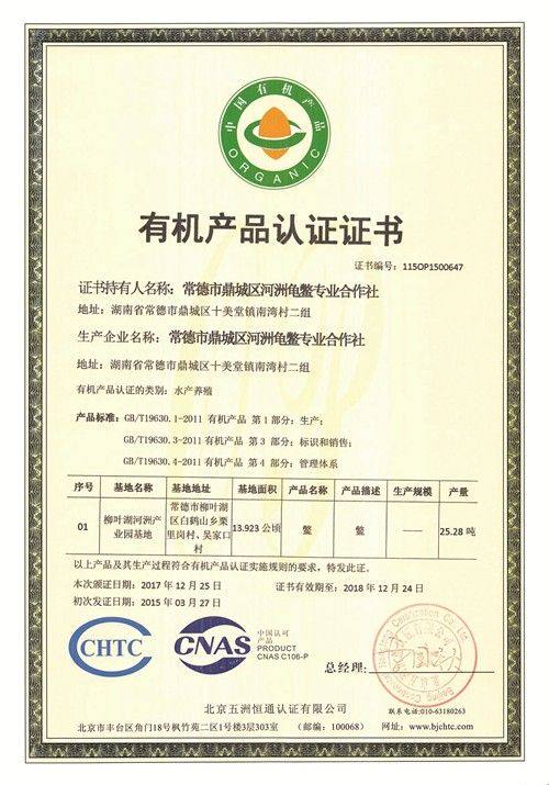 常德市鼎城区河洲龟鳖专业合作社通过有机产品认证
