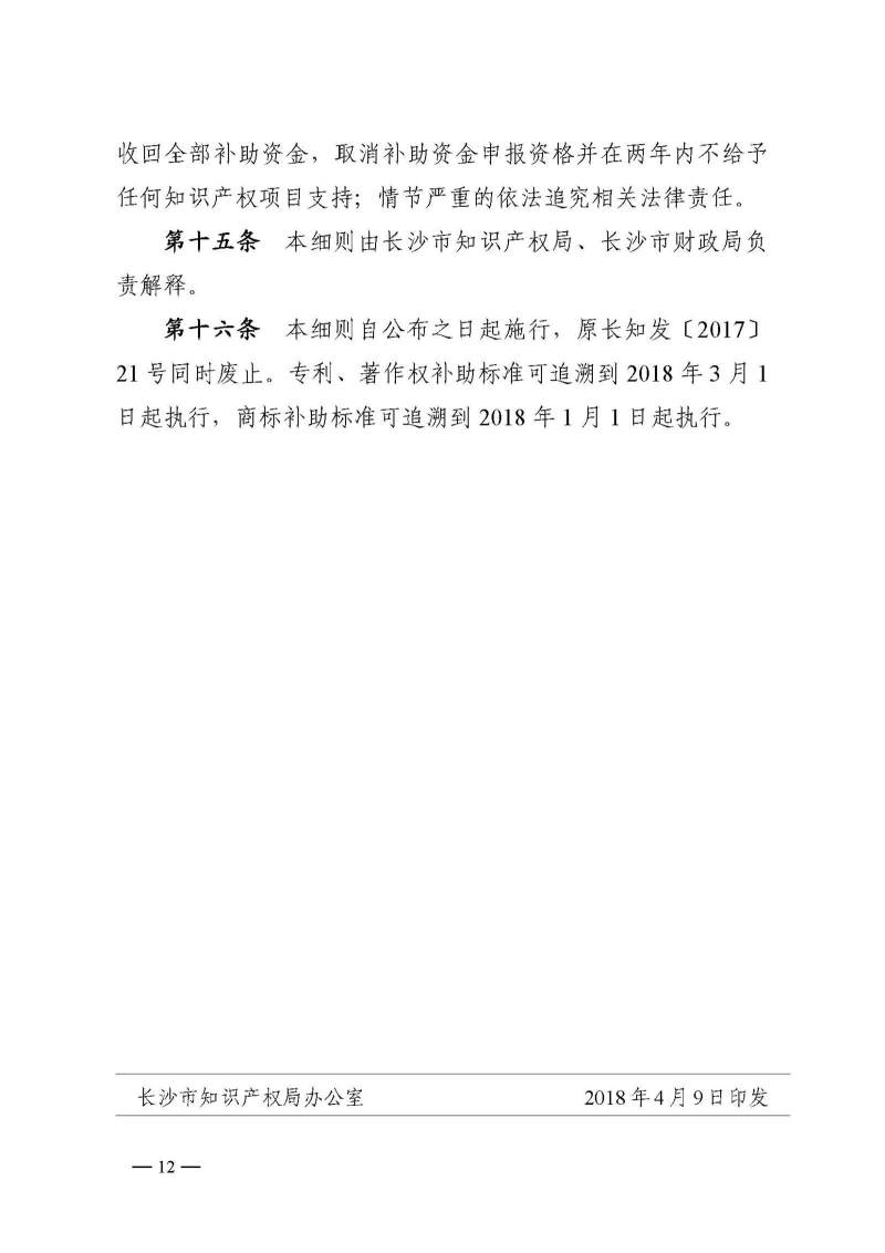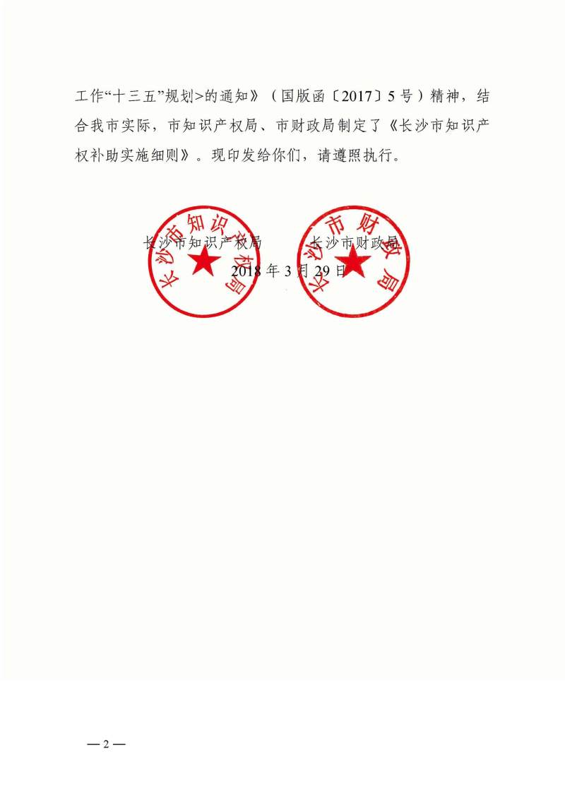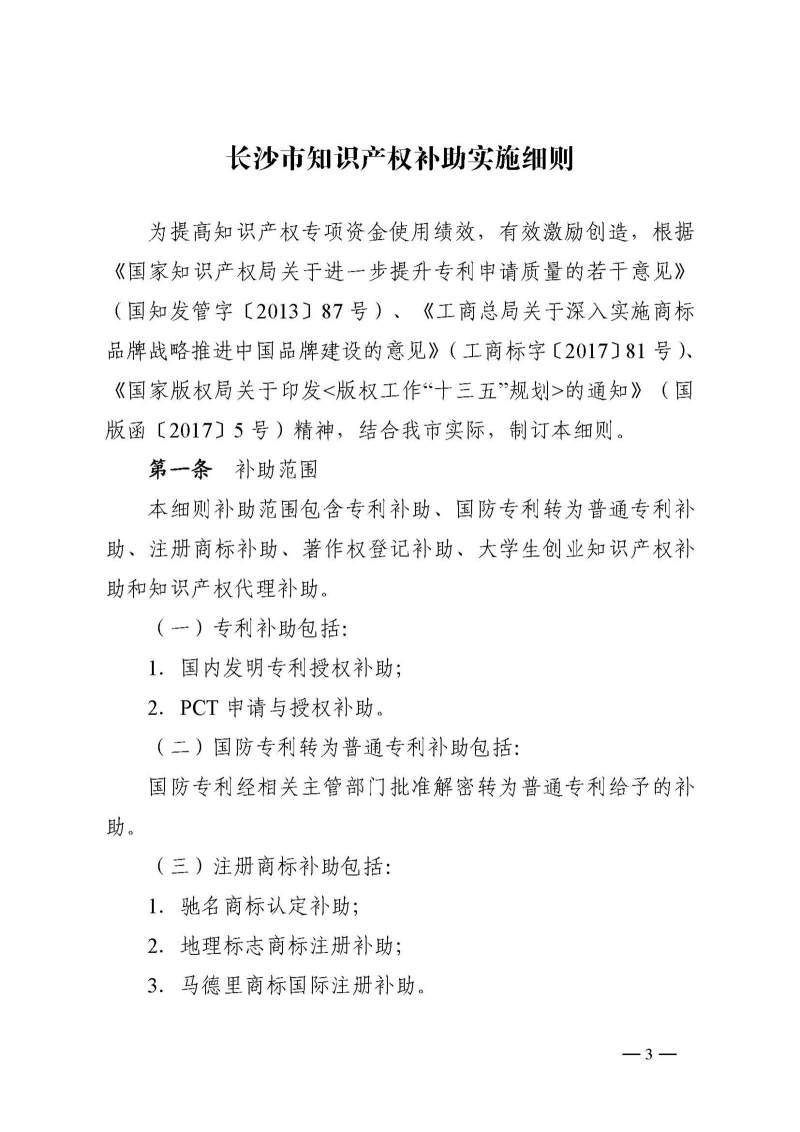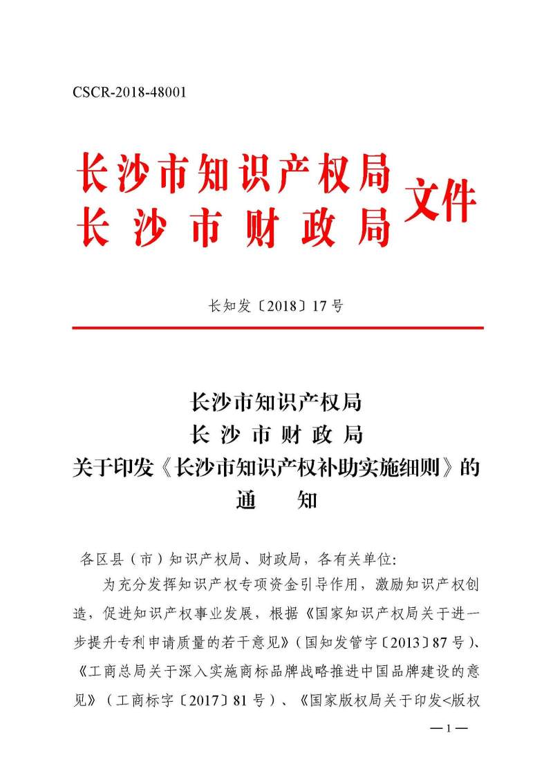 长沙市关于印发《长沙市知识产权补助实施细则》的 通知