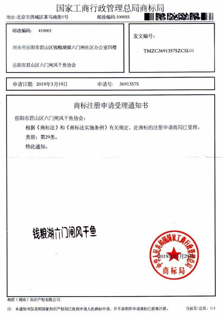 热烈祝贺“君山芦笋”和"钱粮湖六门闸风干鱼"取得地标的商标注册证!