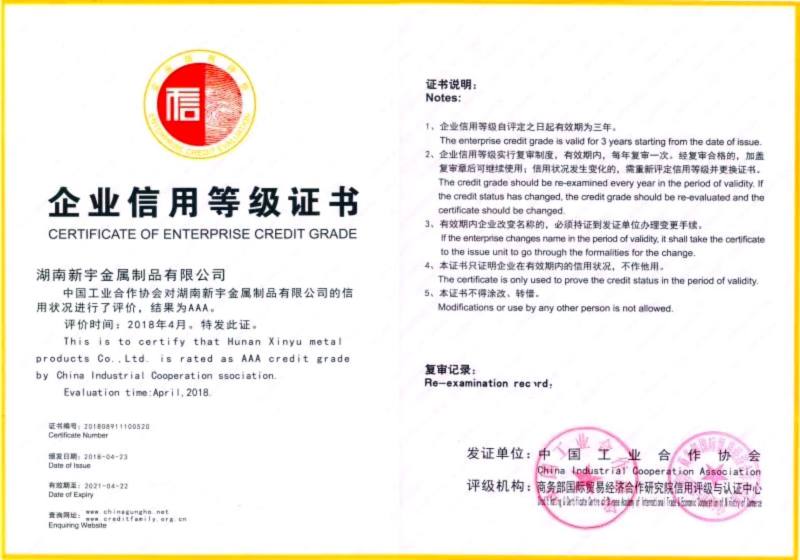 热烈祝贺湖南新宇金属制品有限公司通过全国AAA级企业评定!我公司办理的全国AAA级企业资质由中国工业合作协会评价,商务部国际贸易经济合作研究院信用评级与认证中心进行评级,并出具评级报告,评价结果在商务部信用评价与认证中心官网查询,国家级权威机构评定,可有效提高企业形象,对参加招投标和项目申报可获得额外加分,欢迎咨询!