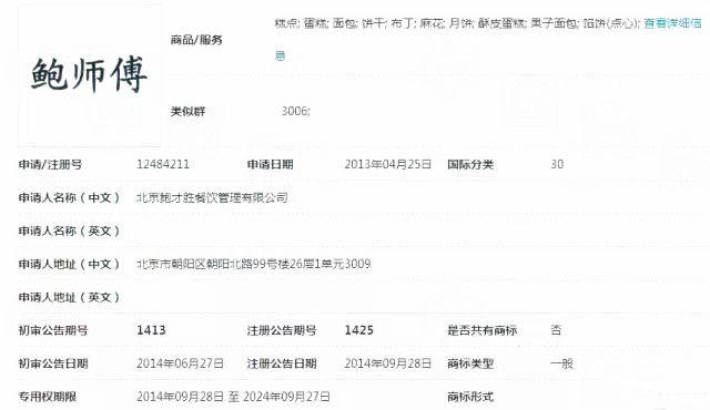 虽然有第30类的商标,但是只是一个男子的头像,并没有文字商标。其在全国发展的300余家店正是通过加盟而来。所以道歉的此“鲍师傅”非我们理解的彼“鲍师傅”。