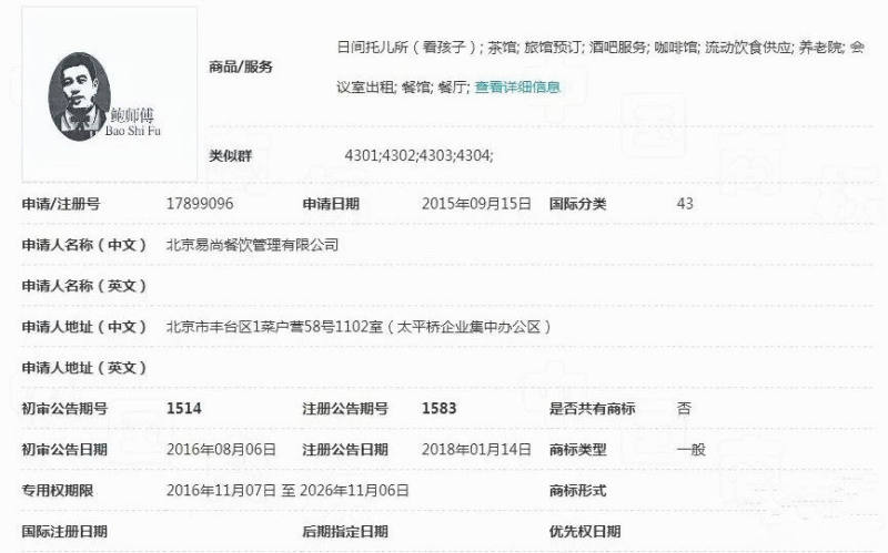 北京易尚餐饮成立于2013年,是综合性餐饮企业。易尚餐饮自2015年开始在其他品类注册鲍师傅商标,包括2015年9月,在32分类(啤酒矿泉水果汁等)、和43分类(茶馆咖啡馆等)申请了鲍师傅商标。