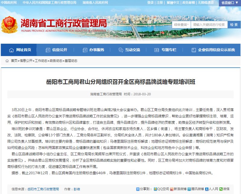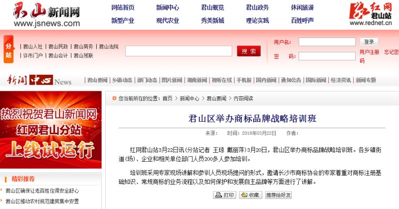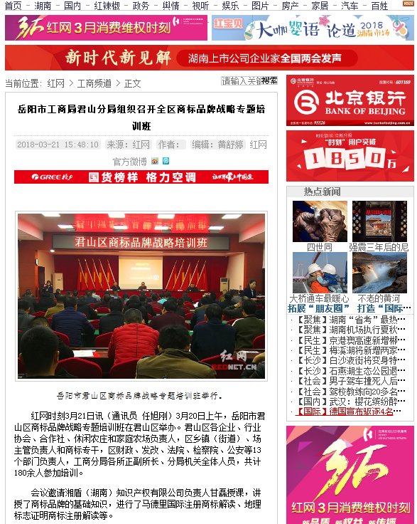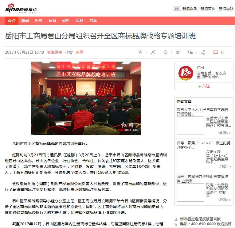 各大新闻媒体关于我公司在君山开展的商标品牌战略专题培训