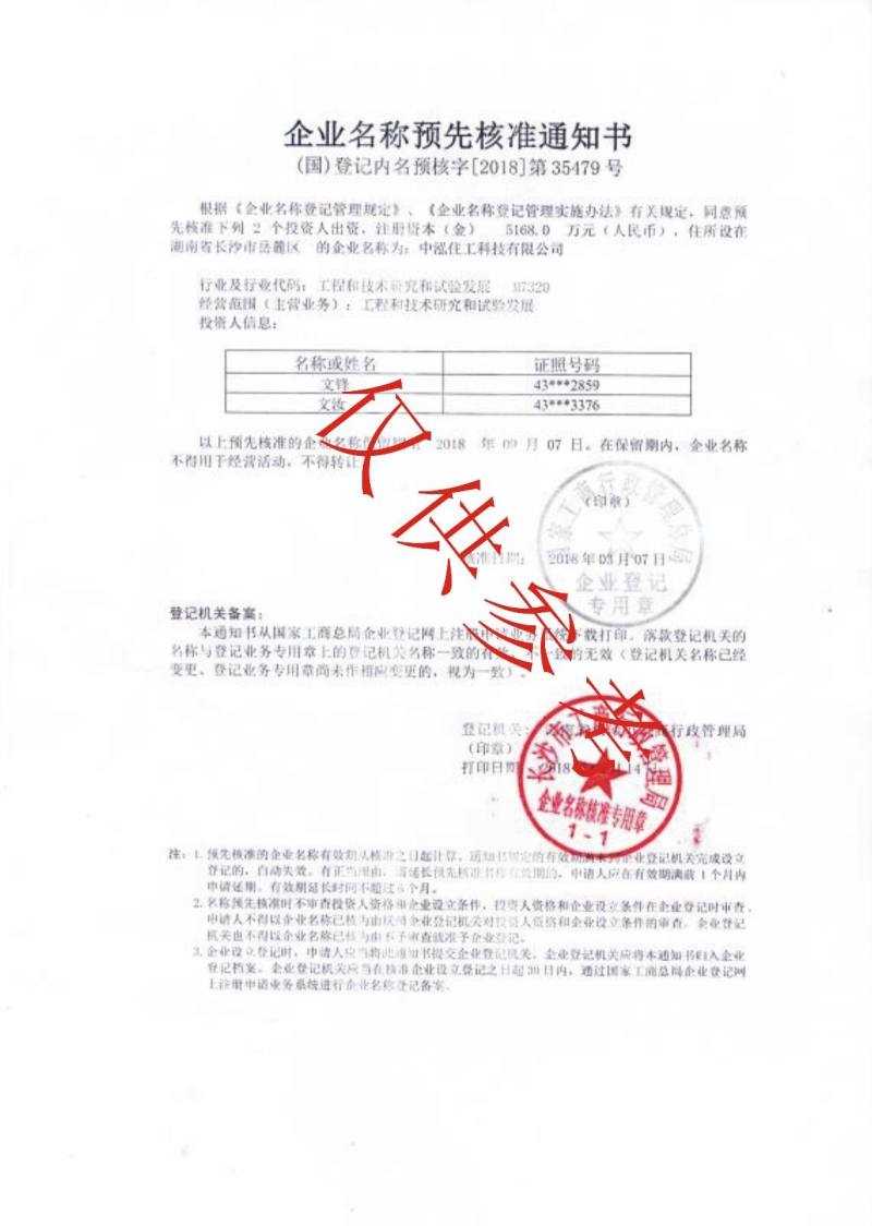 中泓住工科技有限公司名称核准通知书