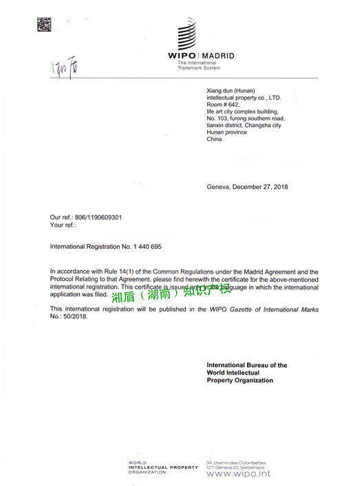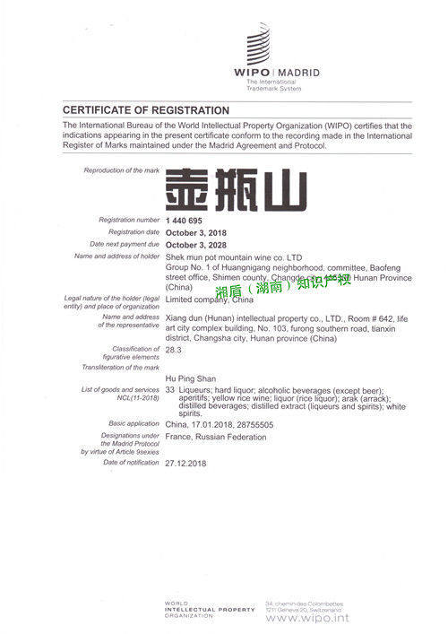 (商标国际注册)石门壶瓶山酒业有限公司“壶瓶山”国际商标注册成功
