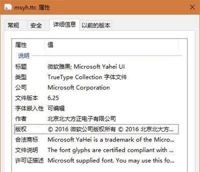 通过图片可知,“微软雅黑”字体版权归微软公司和北京北大方正电子有限公司共有。如果是只在电脑上显示,或者临时打印,不用于商业用途,是可以免费使用的。如果用于商业用途,或者用于Windows系统以外的电脑系统中显示文字,就涉及侵权行为。