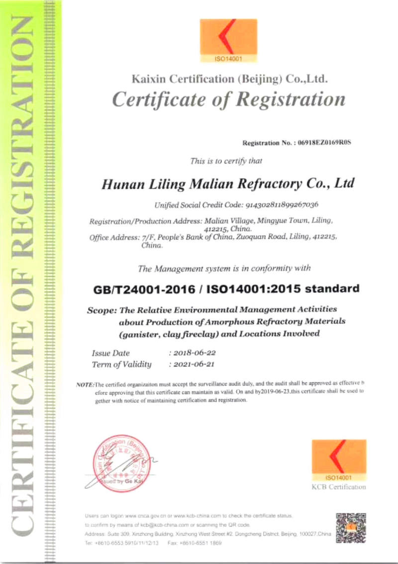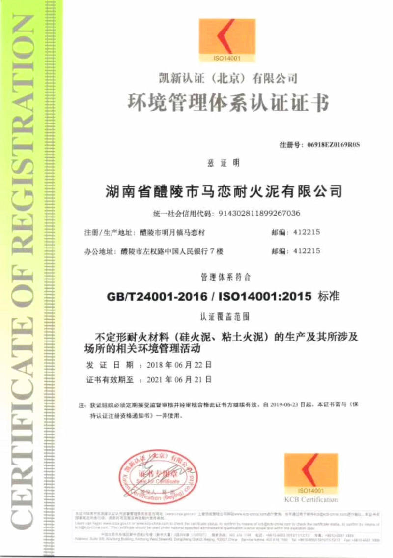 湖南省醴陵市马恋耐火泥公司通过环境体系认证