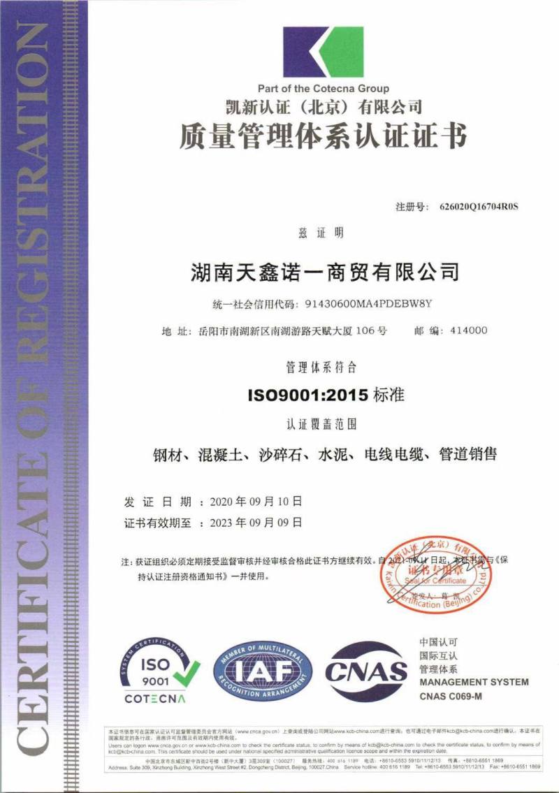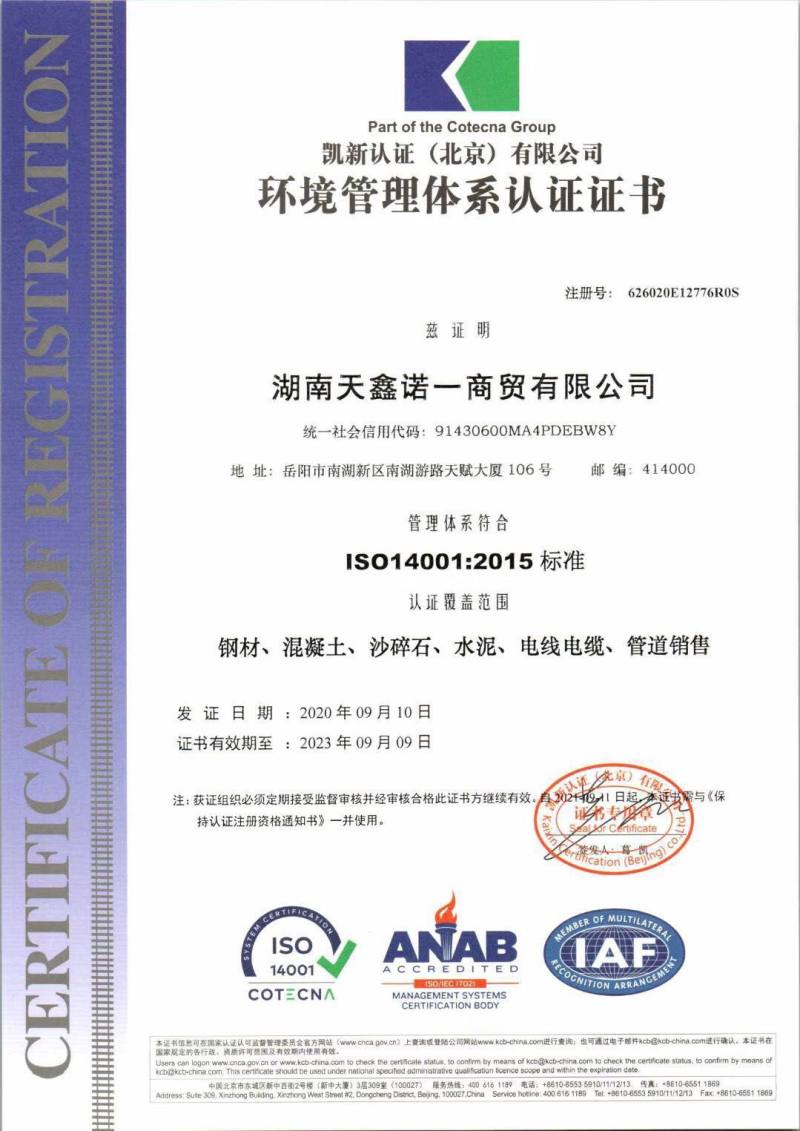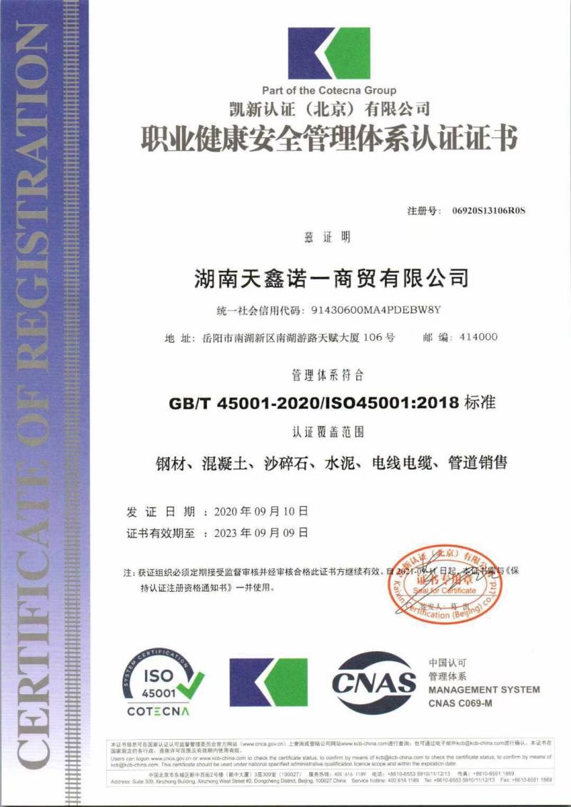 天鑫诺一公司通过质量、环境、职业健康三体系认证