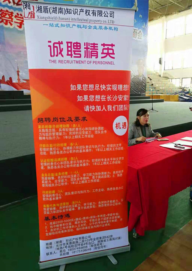 2018年11月27日下午,湘盾知识产权甘磊总经理、熊金辉副总经理、罗芳主管再次受邀来到甘磊总经理的母校湖南警察学院,参加2019届毕业生供需见面会。本次参会,我公司带来了法务助理、商标代理人、专利代理人,行政助理、储备干部等十多个岗位供应届毕业生们选择。