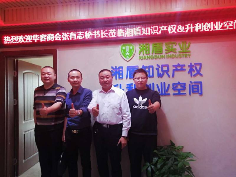 4月8日上午,长沙市华容商会执行秘书长张有志、梓怡轩软装符德良总经理、每天广告严立秋总经理等乡友,莅临湘盾知识产权&升利创业空间指导交流工作。
